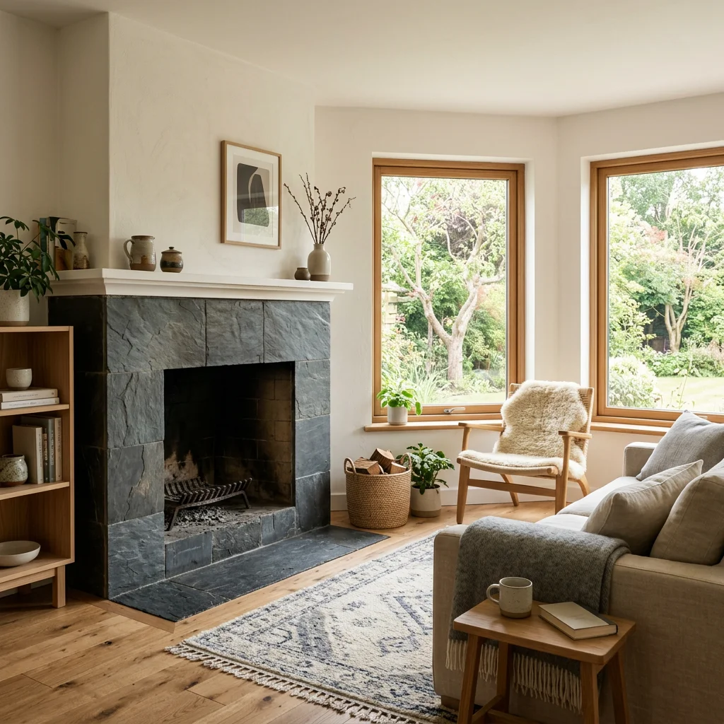 Corner fireplace with slate surround.