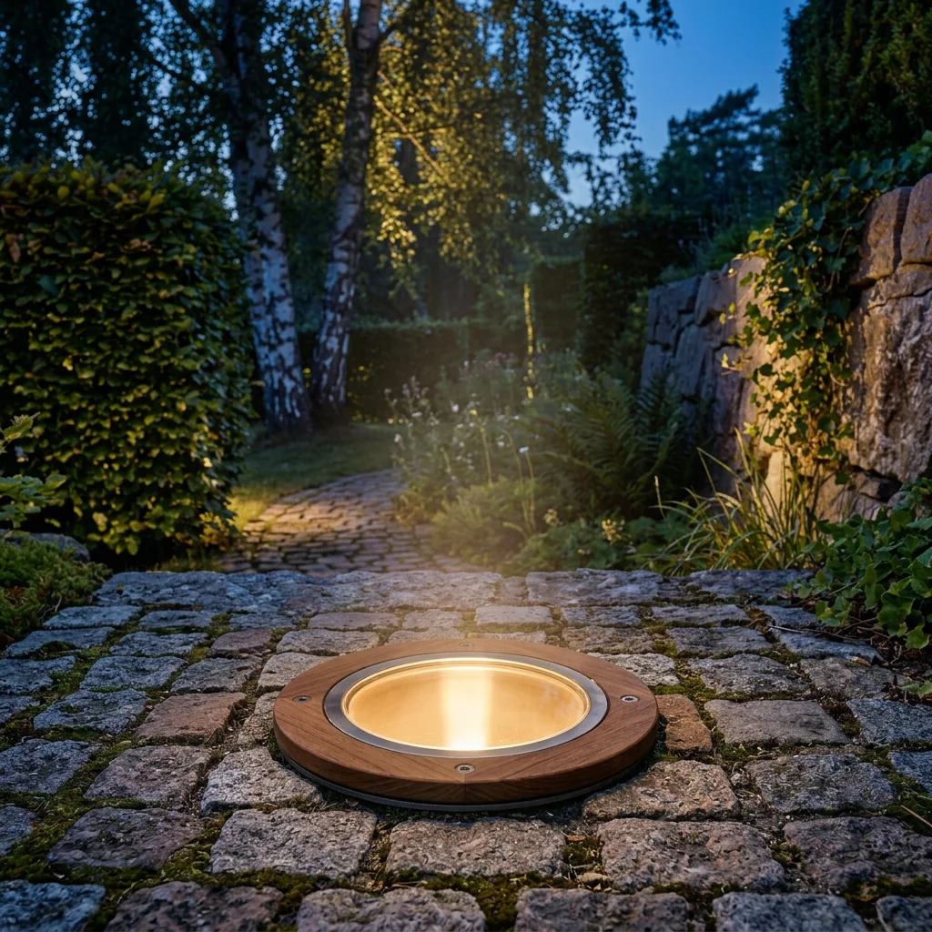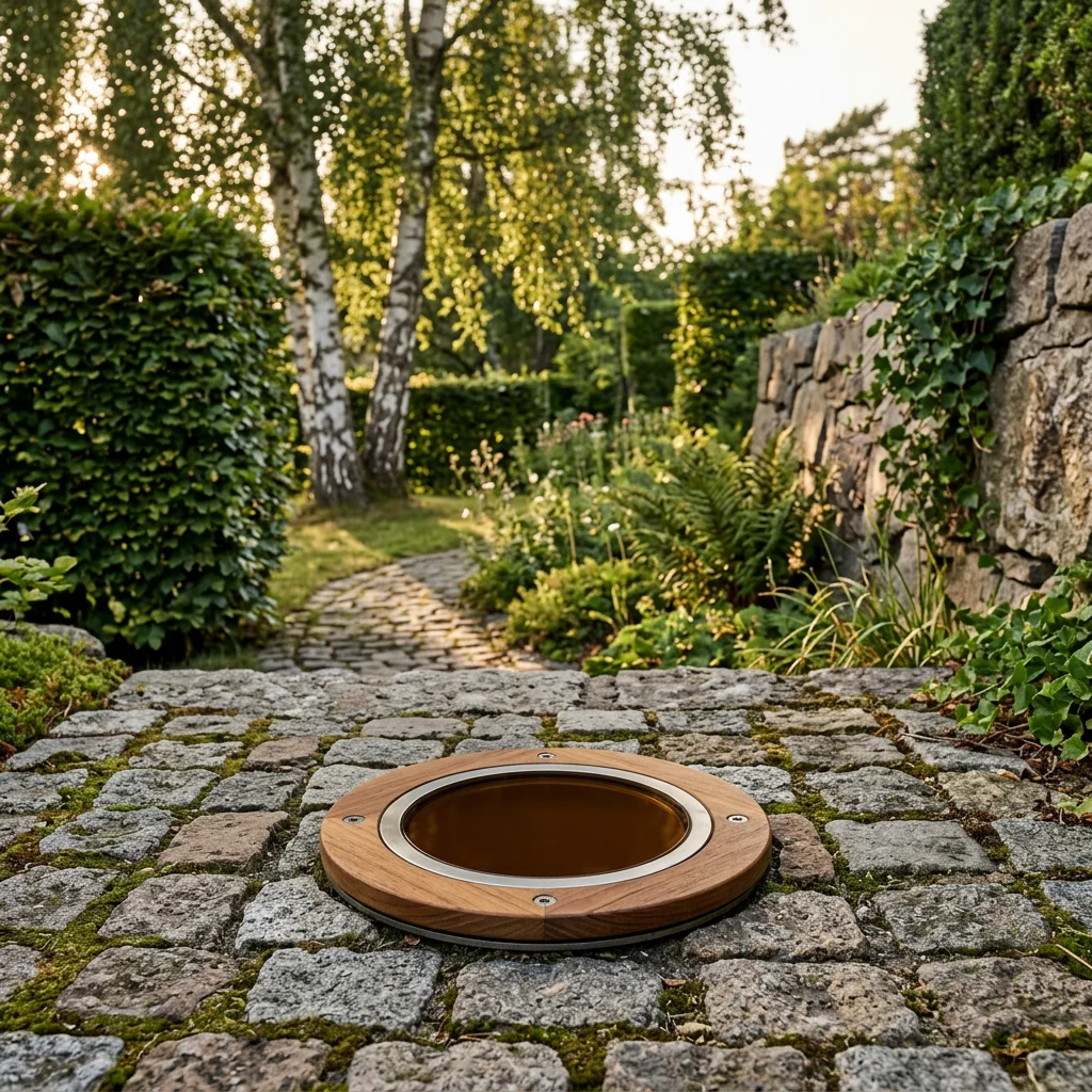 Flush-mount teak deck light with amber lens.